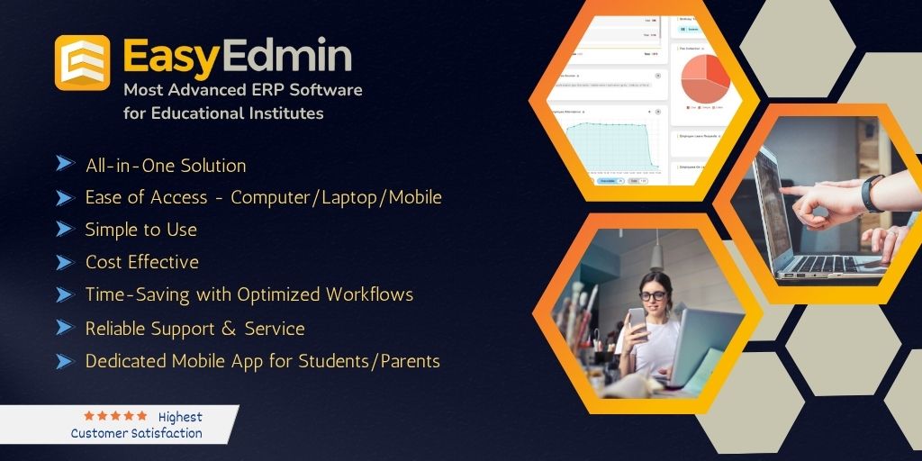 EasyEdmin ERP software makes academic administration very easy and effective. It takes care of all your academic as well as non-academic administrative tasks and allows - (i) teachers to focus more on teaching and student progress, (ii) administrative staff to manage data and operations accurately, (iii) principals to keep staff on track using analytics and (iv) parents to be updated with their ward's progress.